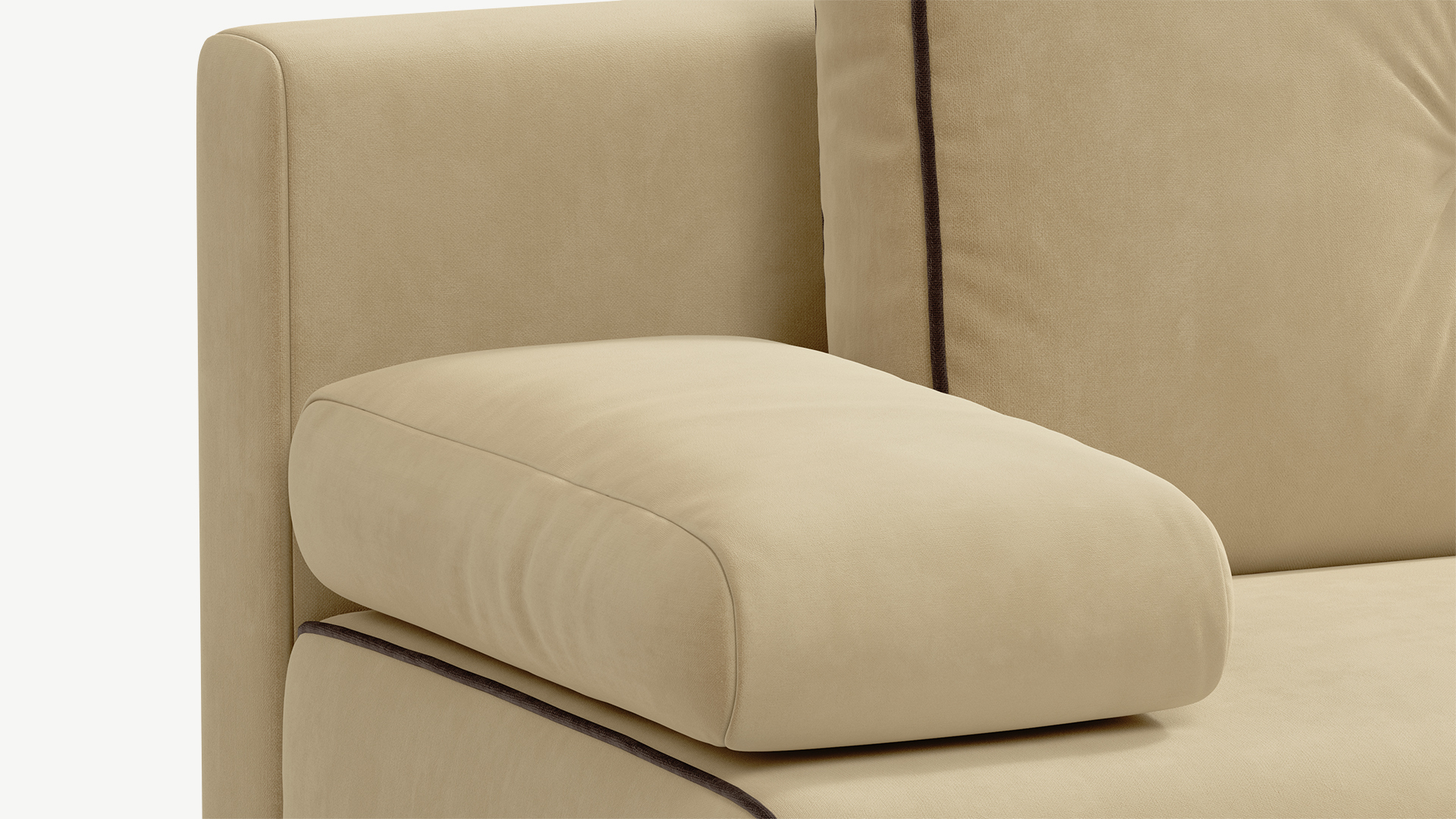 Контрастный кант, украшающий «срезы» на корпусе и приспинных подушках MOON FAMILY 043, лишь усиливает визуальную идентичность элементов, поддерживая эффект наборности.