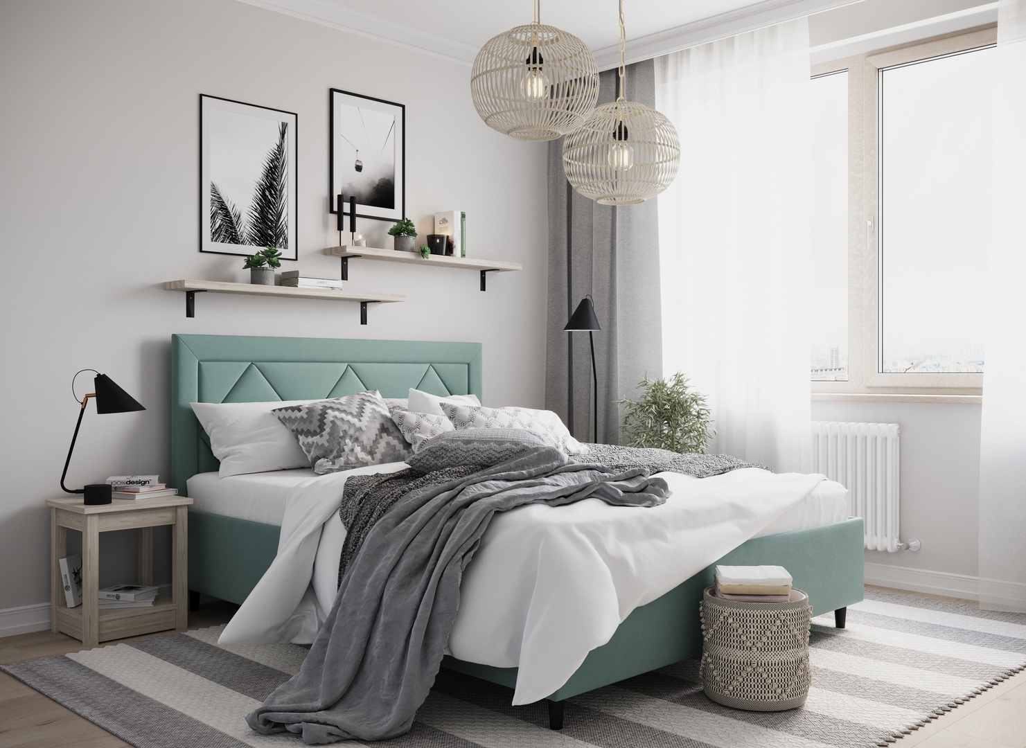 Создать гармоничный интерьер и завершить образ спальни помогут дополнительные аксессуары, например: тумбы, банкетки, подушки.