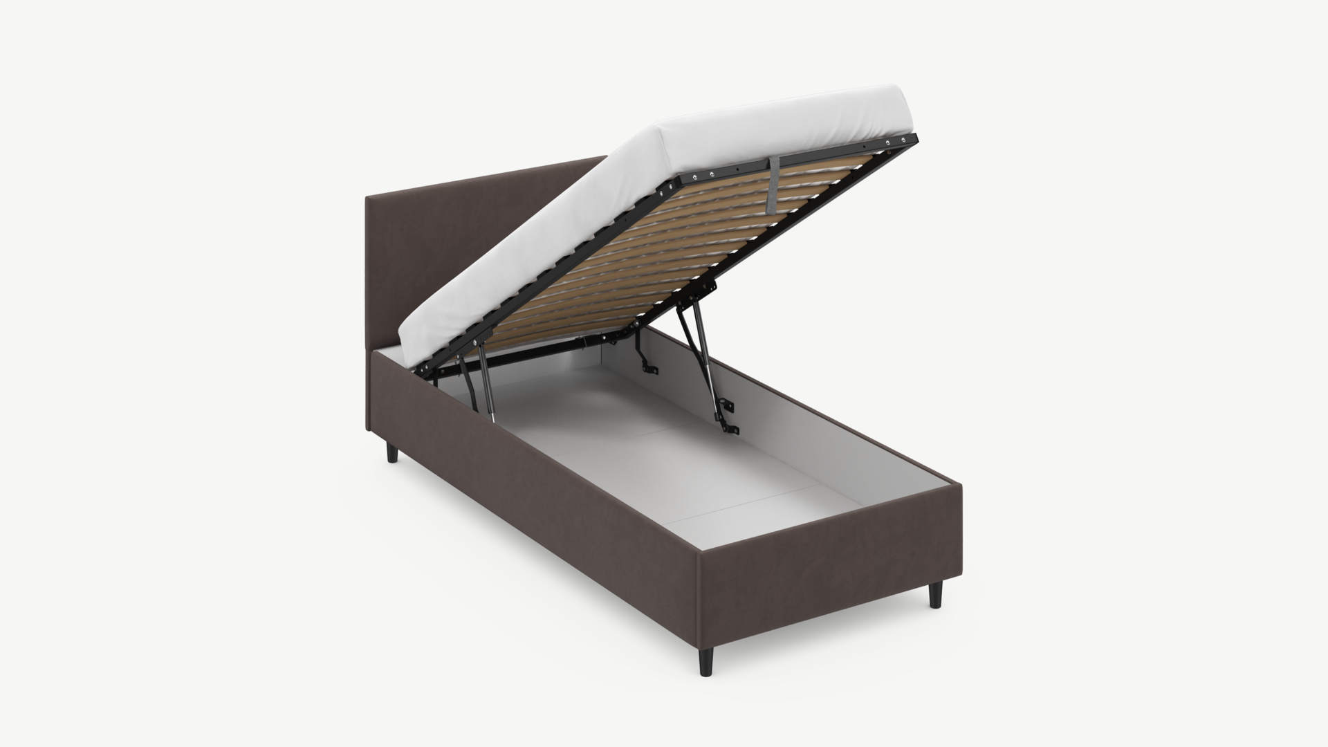 • Скрытая под основанием вместительная емкость без внутренних перегородок позволяет использовать всю площадь подкроватного пространства для хранения вещей.