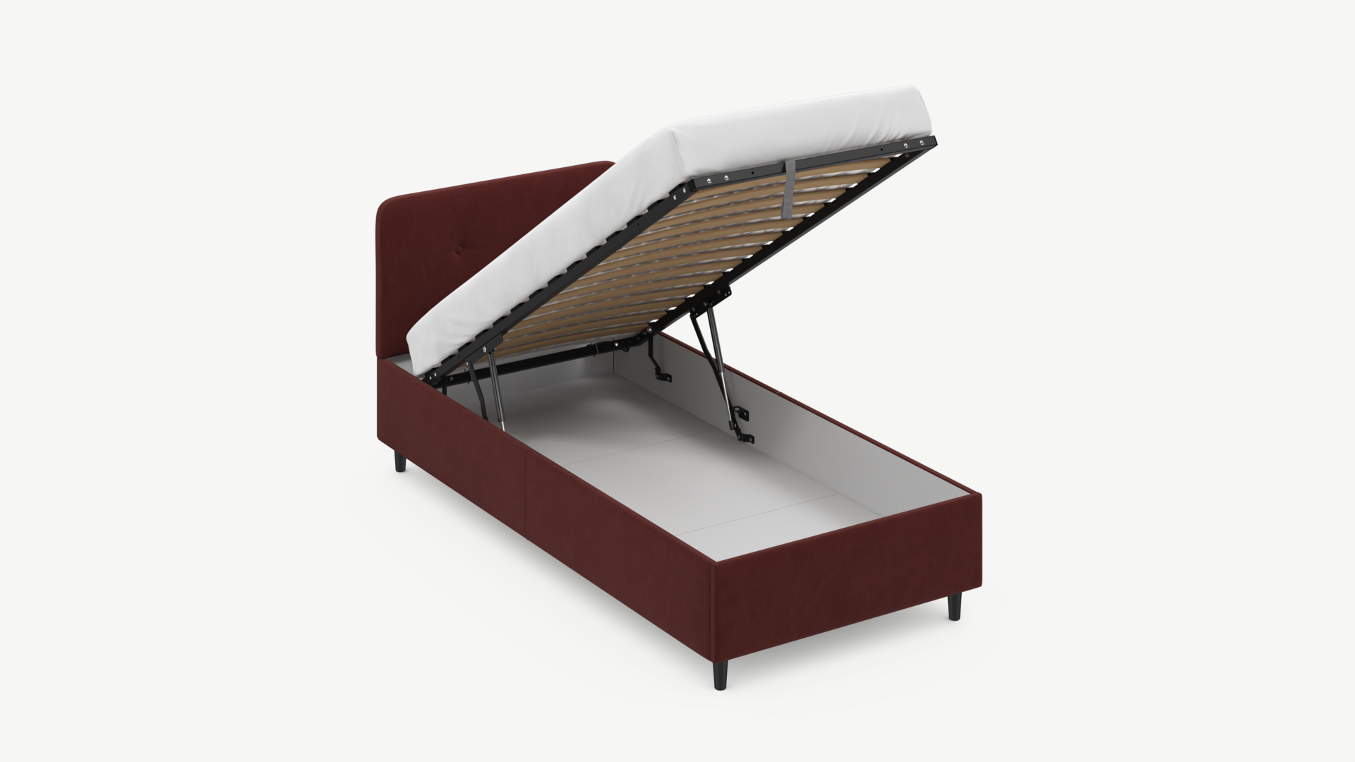 • Скрытая под основанием вместительная емкость без внутренних перегородок позволяет использовать всю площадь подкроватного пространства для хранения вещей.