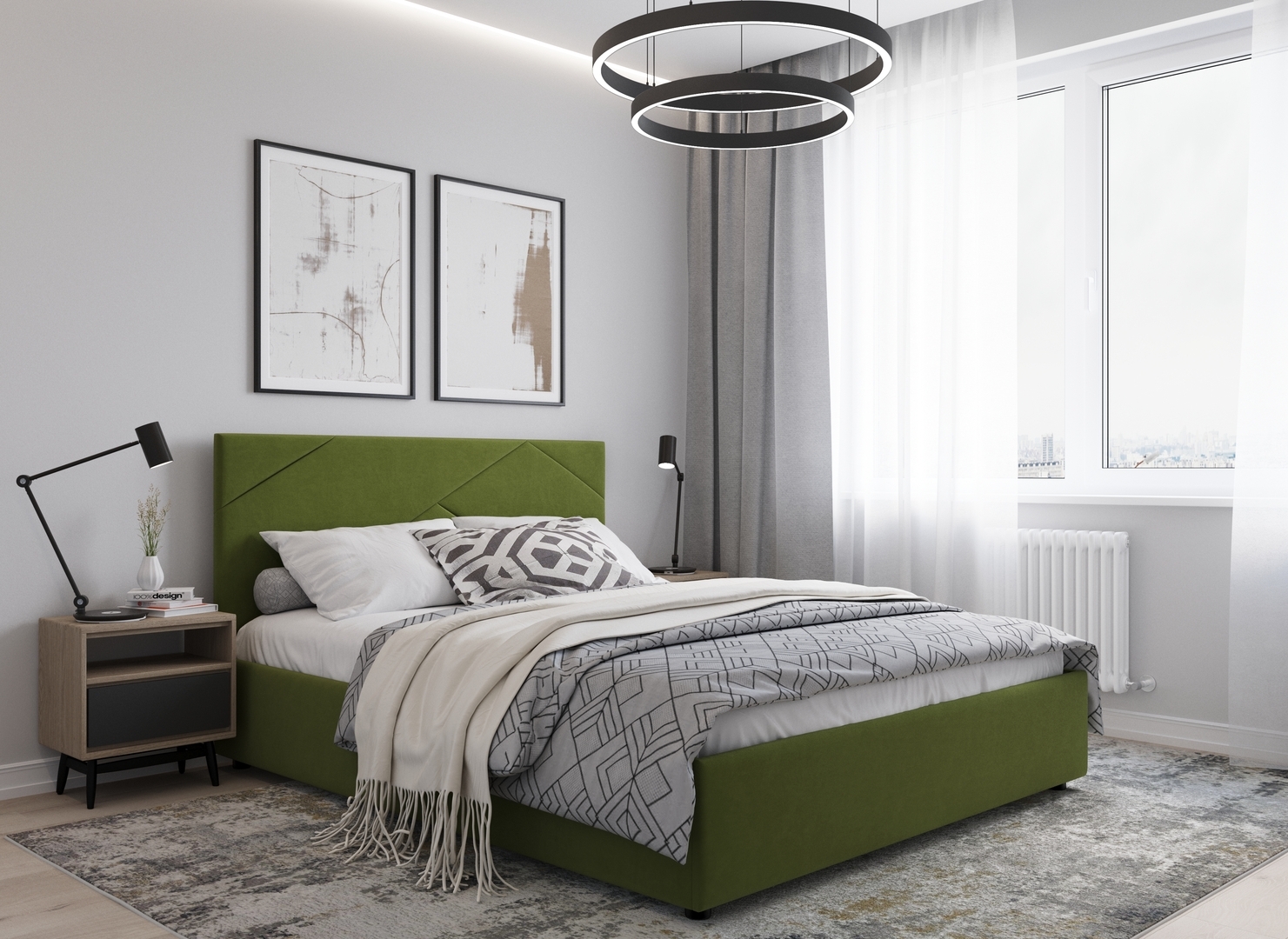 MOON FAMILY 1257 привлекает внимание оригинальным исполнением: широкие полосы ткани эффектно пересекают периметр изголовья, создавая на нем графический орнамент. Лаконичные формы объемных царг создают единый гармоничный образ и фокусируют внимание на центральном текстурном элементе кровати.