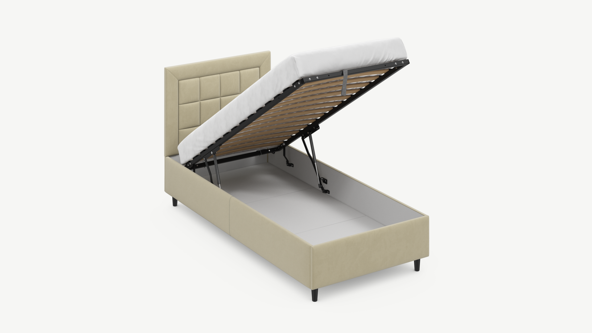 Регулируемый подъемный механизм с газовыми амортизаторами позволяет плавно и бесшумно поднимать и опускать спальное место.