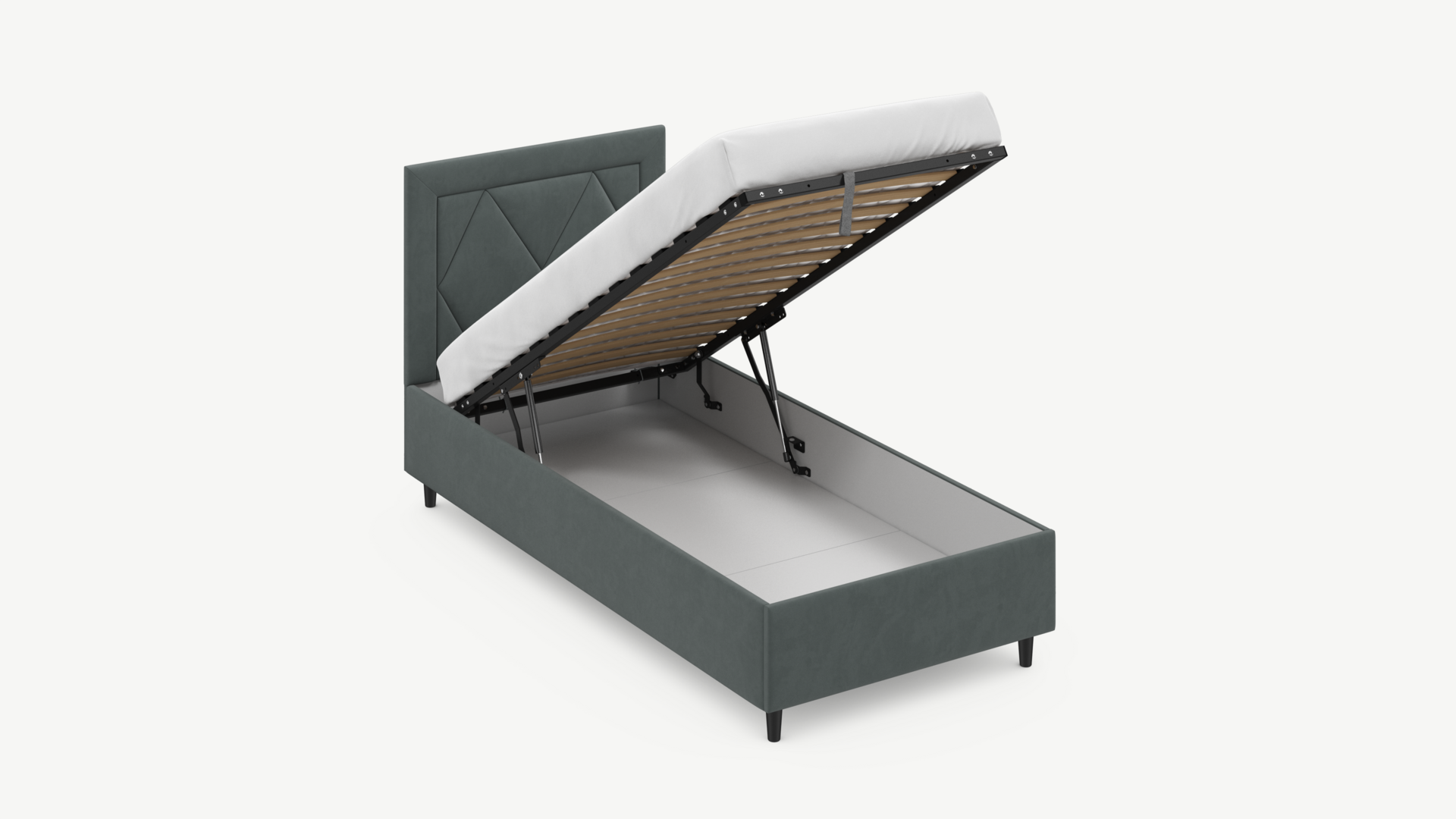 • Скрытая под основанием вместительная емкость без внутренних перегородок позволяет использовать всю площадь подкроватного пространства для хранения вещей.