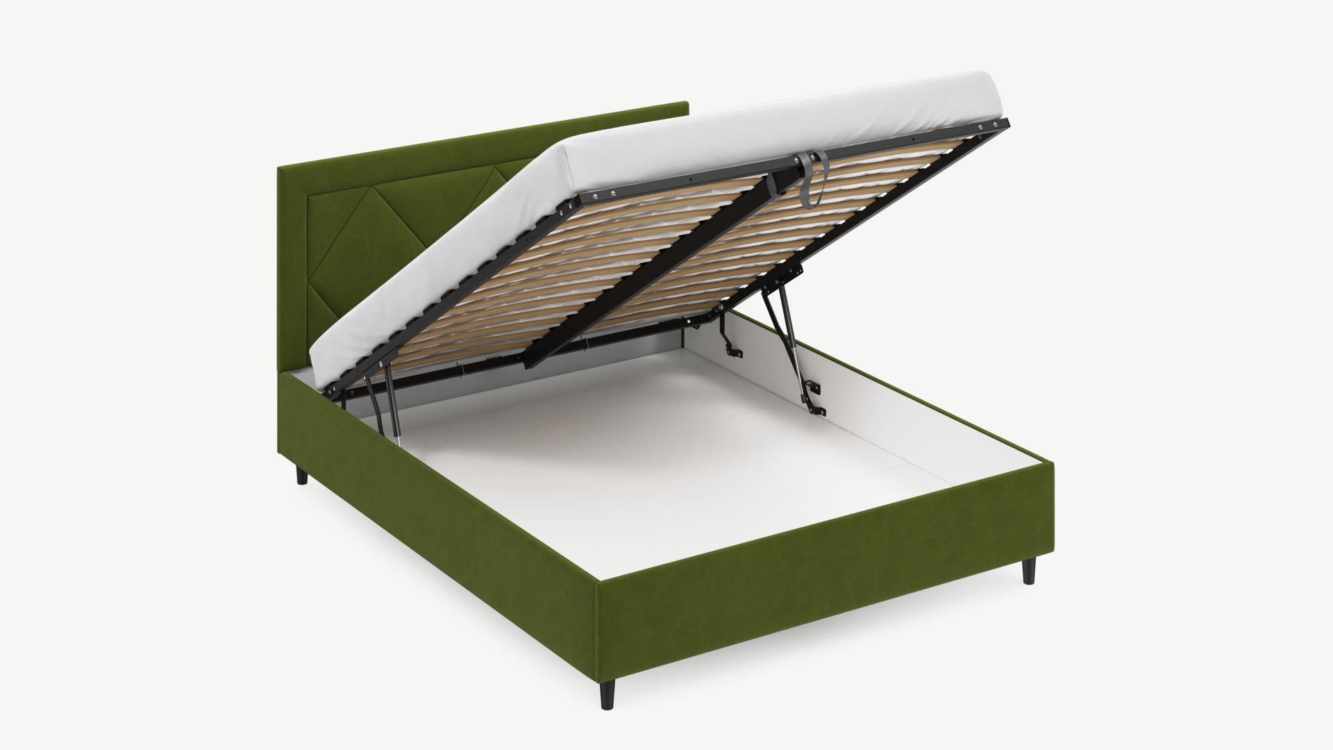 • Скрытая под основанием вместительная емкость без внутренних перегородок позволяет использовать всю площадь подкроватного пространства для хранения вещей.
