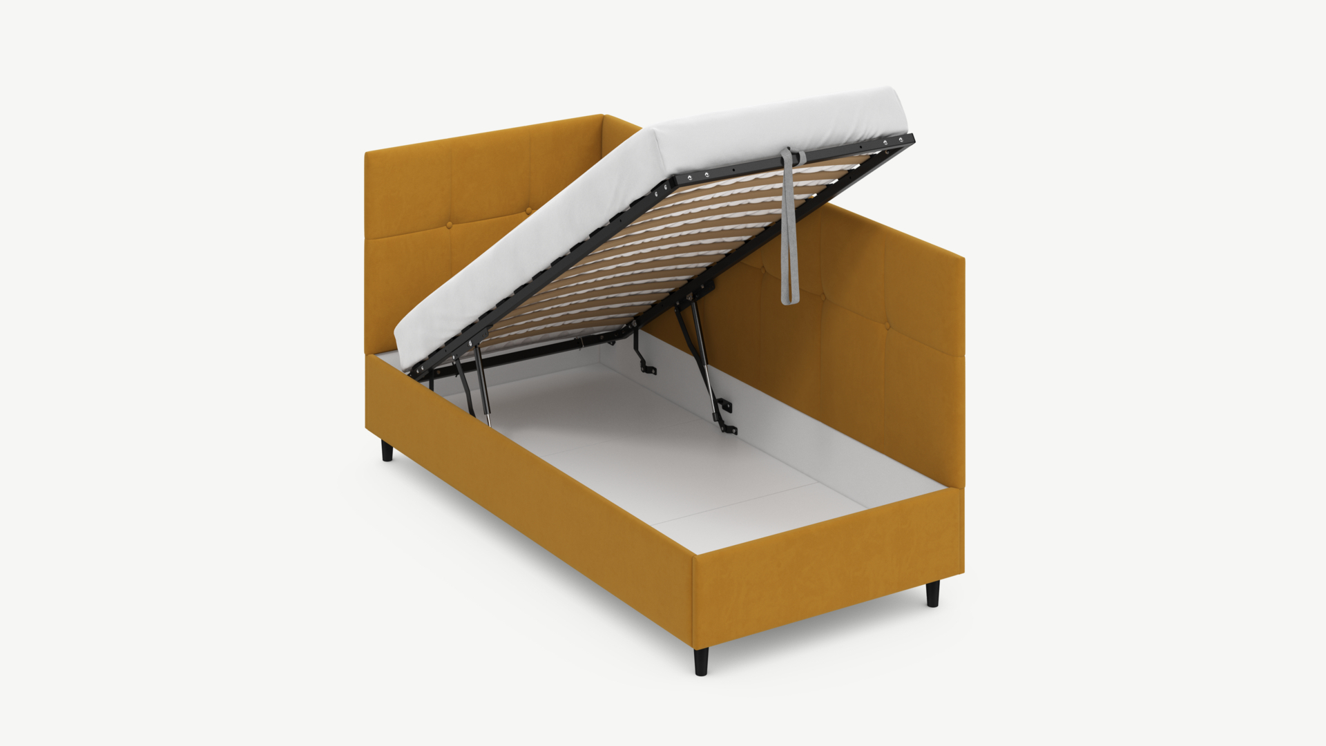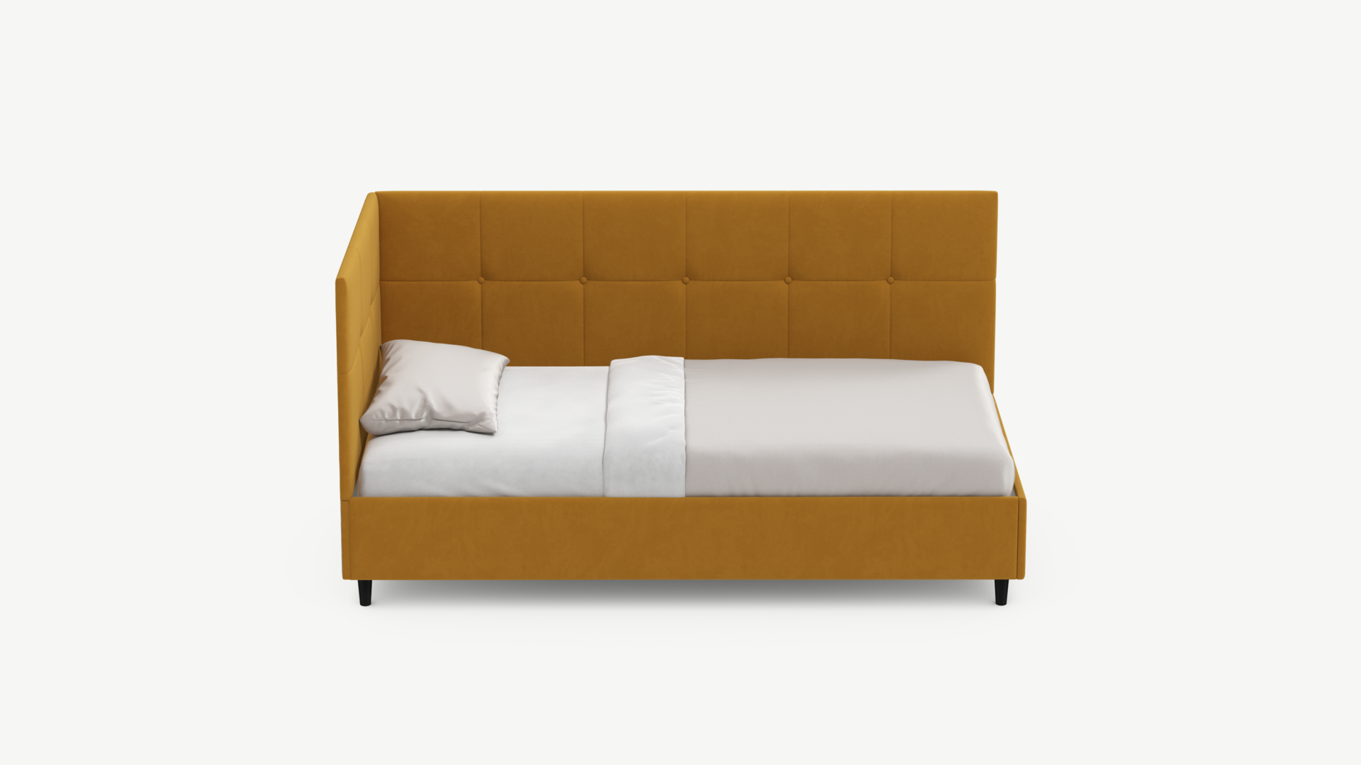Угловая односпальная кровать MOON FAMILY 1261 с мягкой спинкой и изголовьем создаст в Вашей спальне ощущение уюта. Крупная квадратная стежка привносит в интерьер графических акцентов, а вставка из пуговиц наполняет пространство ощущением домашнего тепла.