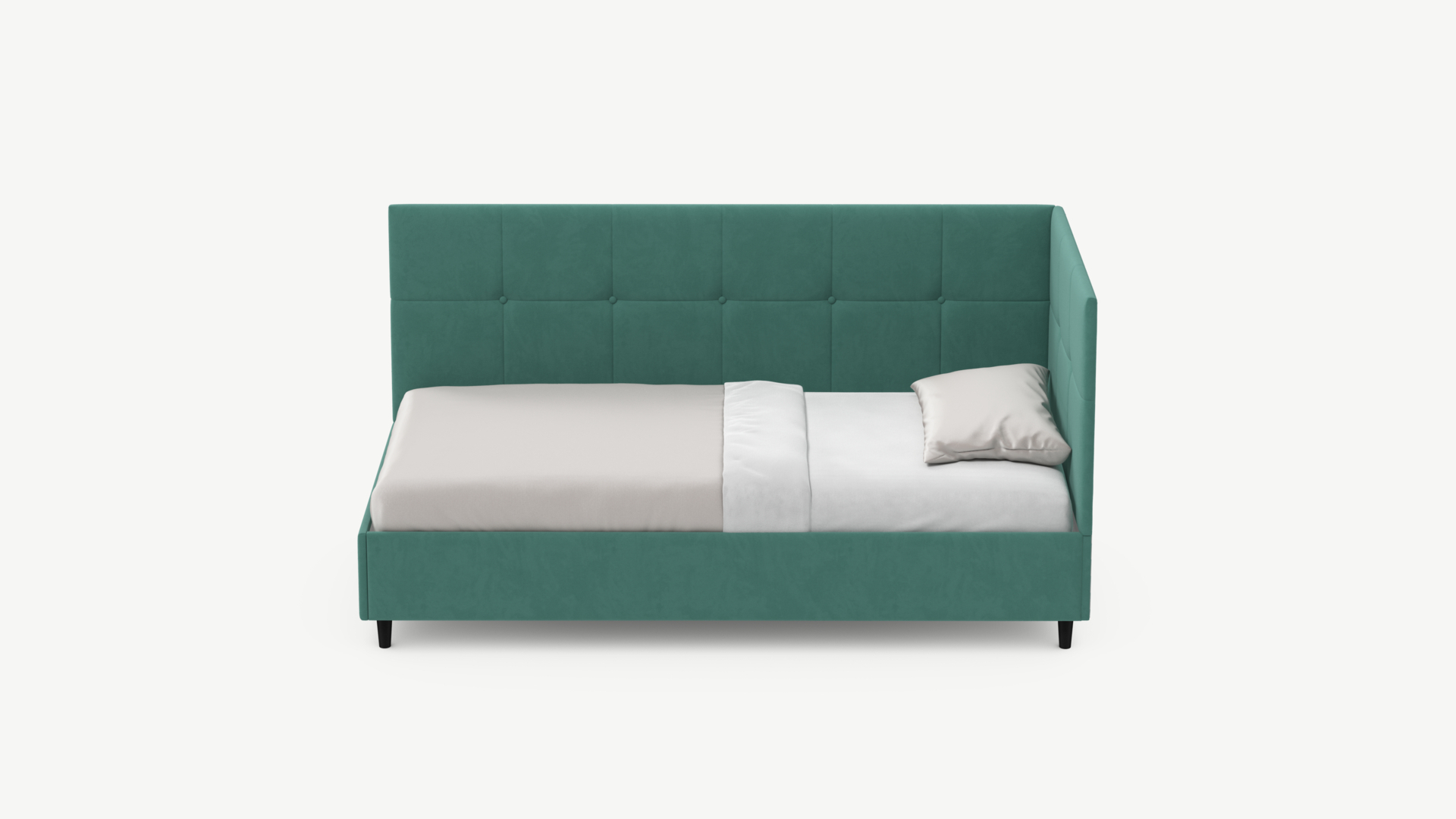 Угловая односпальная кровать MOON FAMILY 1261 с мягкой спинкой и изголовьем создаст в Вашей спальне ощущение уюта. Крупная квадратная стежка привносит в интерьер графических акцентов, а вставка из пуговиц наполняет пространство ощущением домашнего тепла.