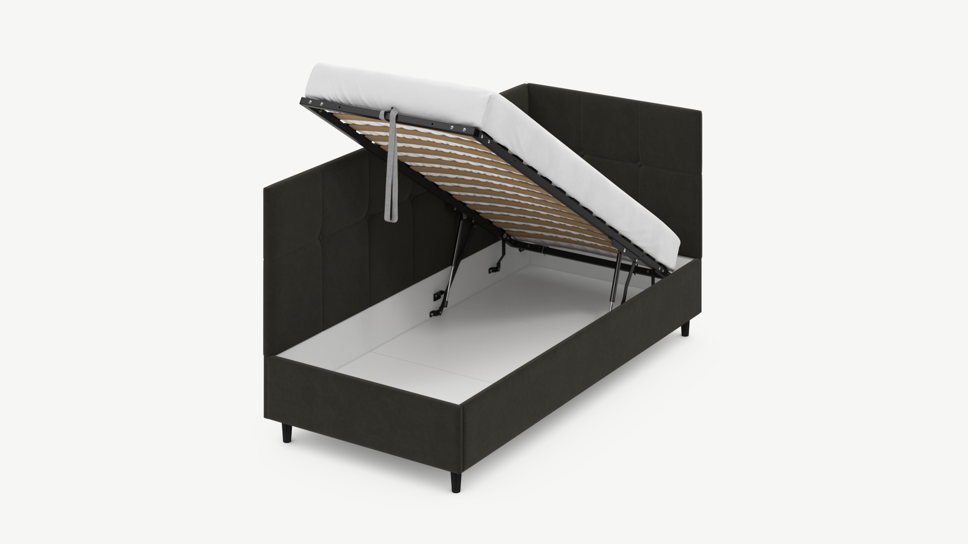 • Скрытая под основанием вместительная емкость без внутренних перегородок позволяет использовать всю площадь подкроватного пространства для хранения вещей.