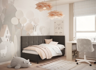 Угловая односпальная кровать MOON FAMILY 1261 с мягкой спинкой и изголовьем создаст в Вашей спальне ощущение уюта. Крупная квадратная стежка привносит в интерьер графических акцентов, а вставка из пуговиц наполняет пространство ощущением домашнего тепла.