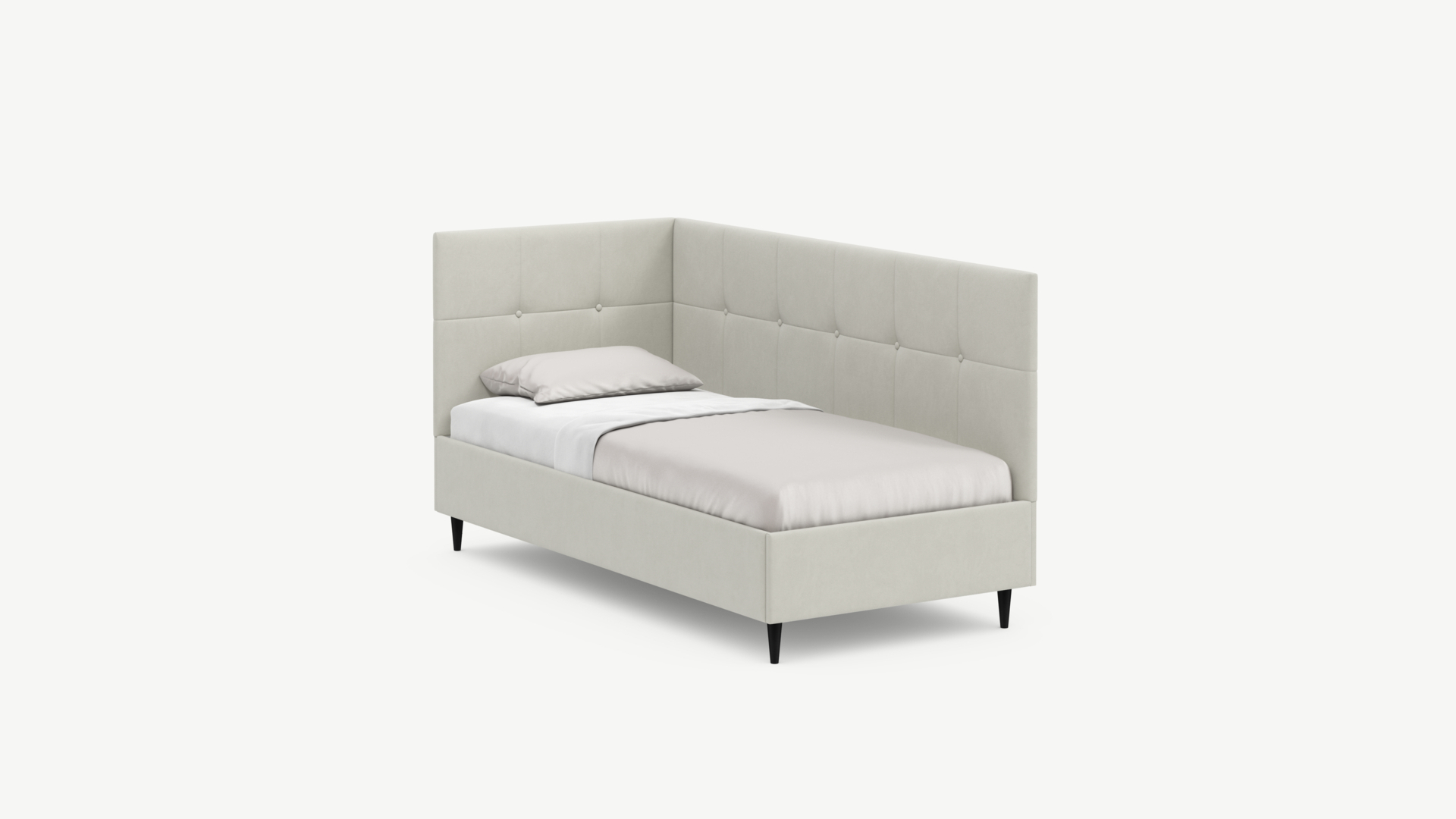 Угловая односпальная кровать MOON FAMILY 1261 с мягкой спинкой и изголовьем создаст в Вашей спальне ощущение уюта. Крупная квадратная стежка привносит в интерьер графических акцентов, а вставка из пуговиц наполняет пространство ощущением домашнего тепла.