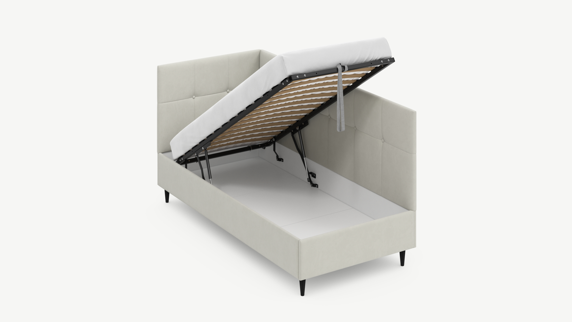 • Скрытая под основанием вместительная емкость без внутренних перегородок позволяет использовать всю площадь подкроватного пространства для хранения вещей.