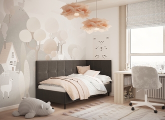 Угловая односпальная кровать MOON FAMILY 1261 с мягкой спинкой и изголовьем создаст в Вашей спальне ощущение уюта. Крупная квадратная стежка привносит в интерьер графических акцентов, а вставка из пуговиц наполняет пространство ощущением домашнего тепла.