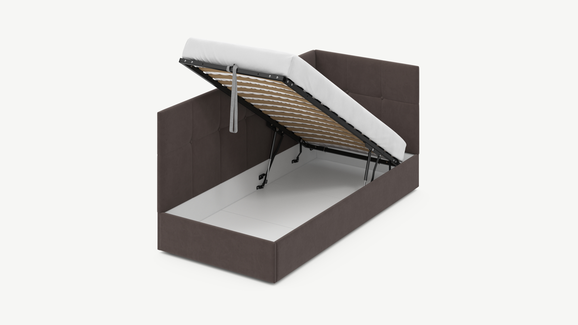 • Скрытая под основанием вместительная емкость без внутренних перегородок позволяет использовать всю площадь подкроватного пространства для хранения вещей.