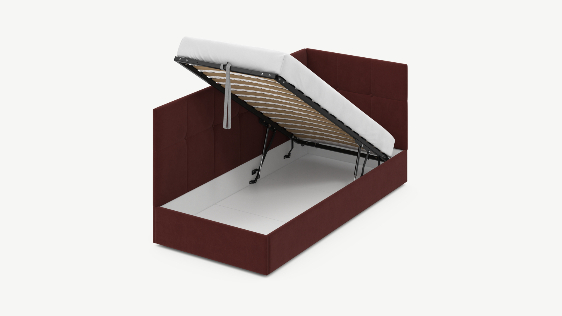 • Регулируемый подъемный механизм имеет два положения установки газовых амортизаторов в зависимости от веса матраса. Это дает возможность оптимально подстраивать угол подъема основания, а также плавно и бесшумно поднимать и опускать спальное место.