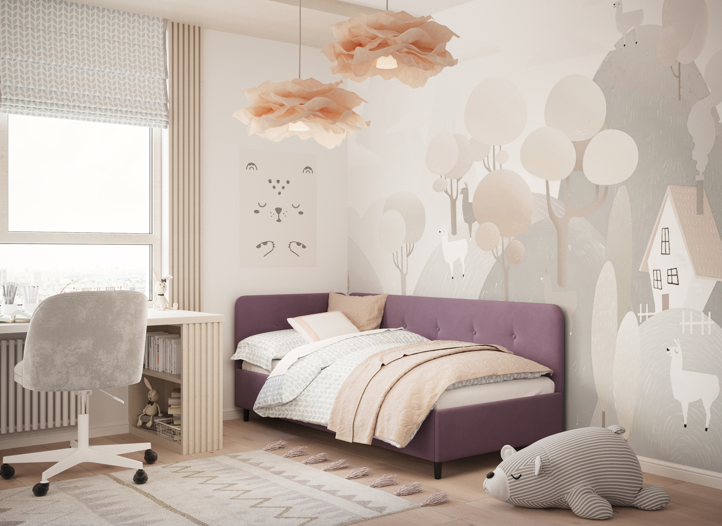 Угловая односпальная кровать MOON FAMILY 1253 с мягкой спинкой и изголовьем обладает округлыми формами, привносящими в интерьер нотки нежности. Изголовье, украшенное пуговицами, добавляет окружающему пространству шарм и уют. Высокие опоры придают кровати визуальной легкости, а также обеспечивают удобство во время уборки.