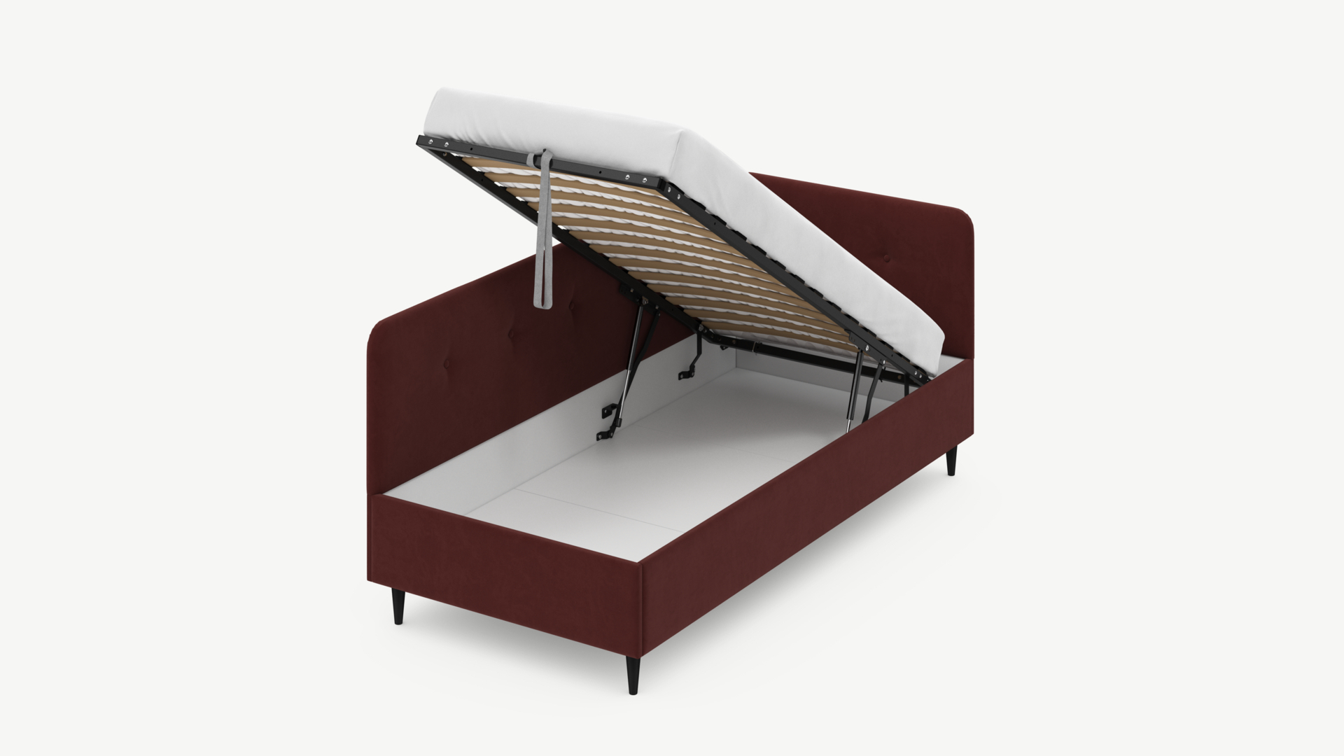 • Скрытая под основанием вместительная емкость без внутренних перегородок позволяет использовать всю площадь подкроватного пространства для хранения вещей.