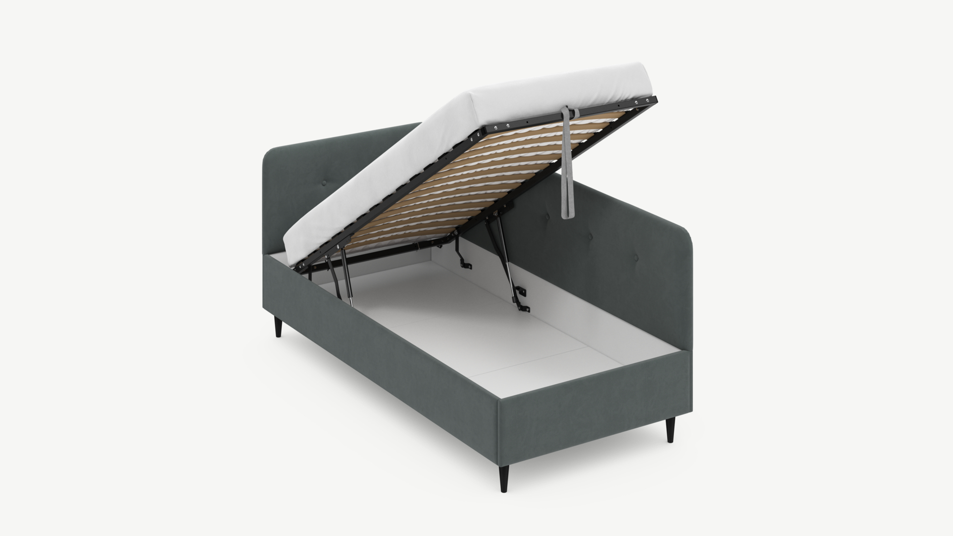 • Скрытая под основанием вместительная емкость без внутренних перегородок позволяет использовать всю площадь подкроватного пространства для хранения вещей.