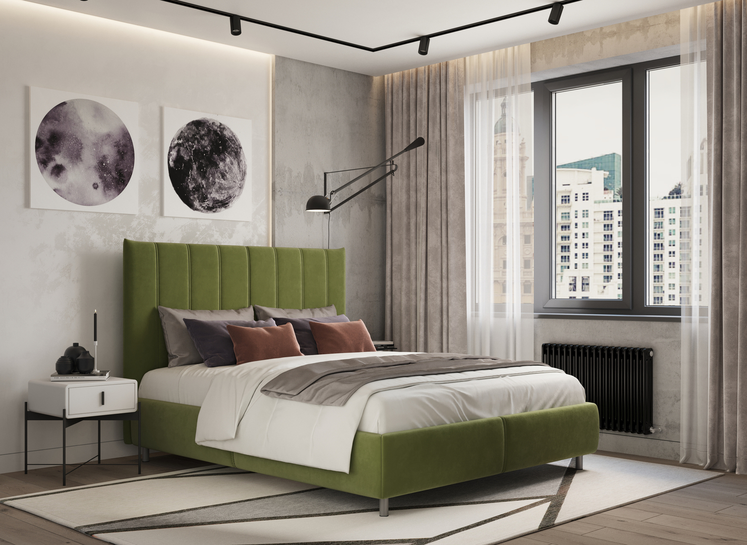 Для кровати MOON 1161 возможно использование одного или нескольких видов обивочного материала разных цветов и фактур. Выбирая ткань для изголовья, обратите внимание на велюр, который выгодно подчеркнет объем декоративной стежки. Удачным материалом для царги может стать подобранный в тон фактурный шенилл. Выбирая ткань по своему вкусу и настроению, Вы определяете звучание спальни.
