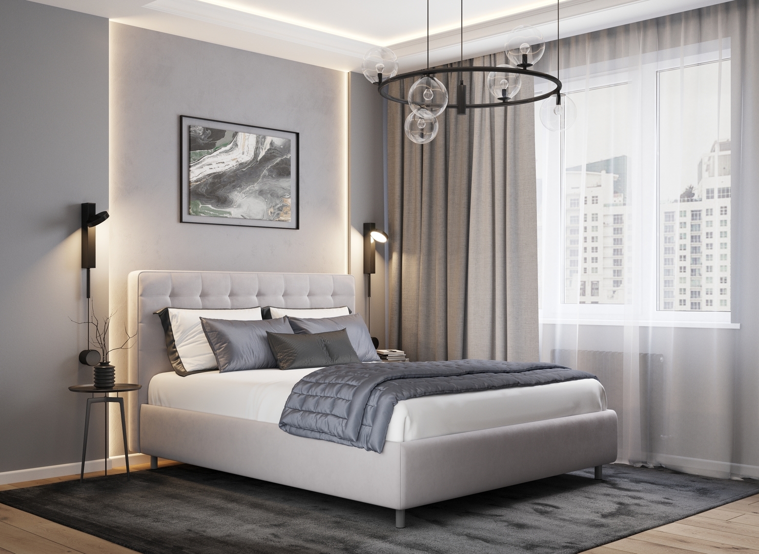 Обратная сторона изголовья выполнена в мебельной ткани и позволяет ставить кровать в центре комнаты для зонирования пространства.