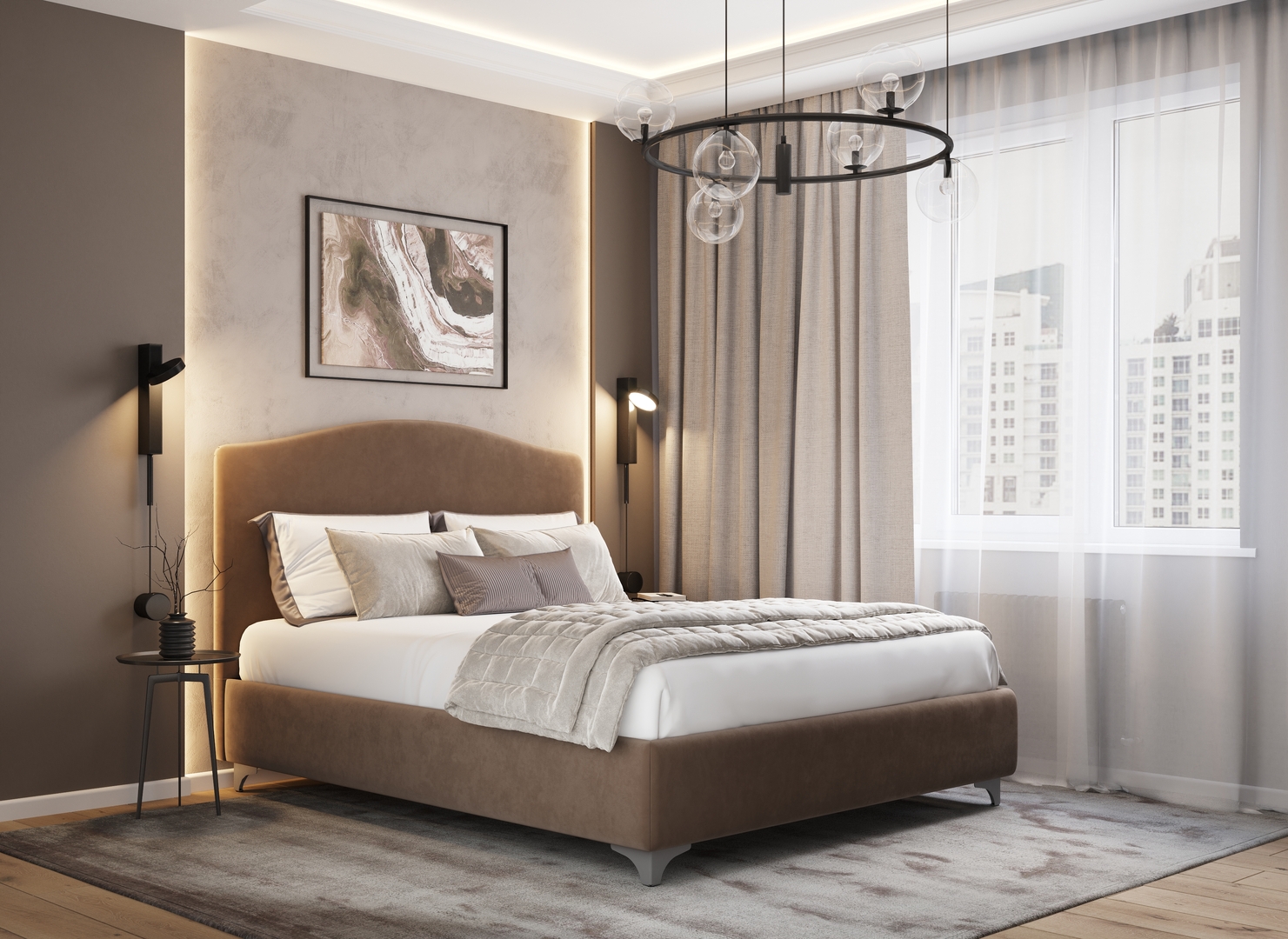 Разнообразие цветовой палитры позволит подобрать желаемый оттенок обивочного материала. Использование светлых цветов поддержит настроение стиля «Сканди». Нейтральные оттенки в цвет интерьера обыграют спальню в Современном стиле.