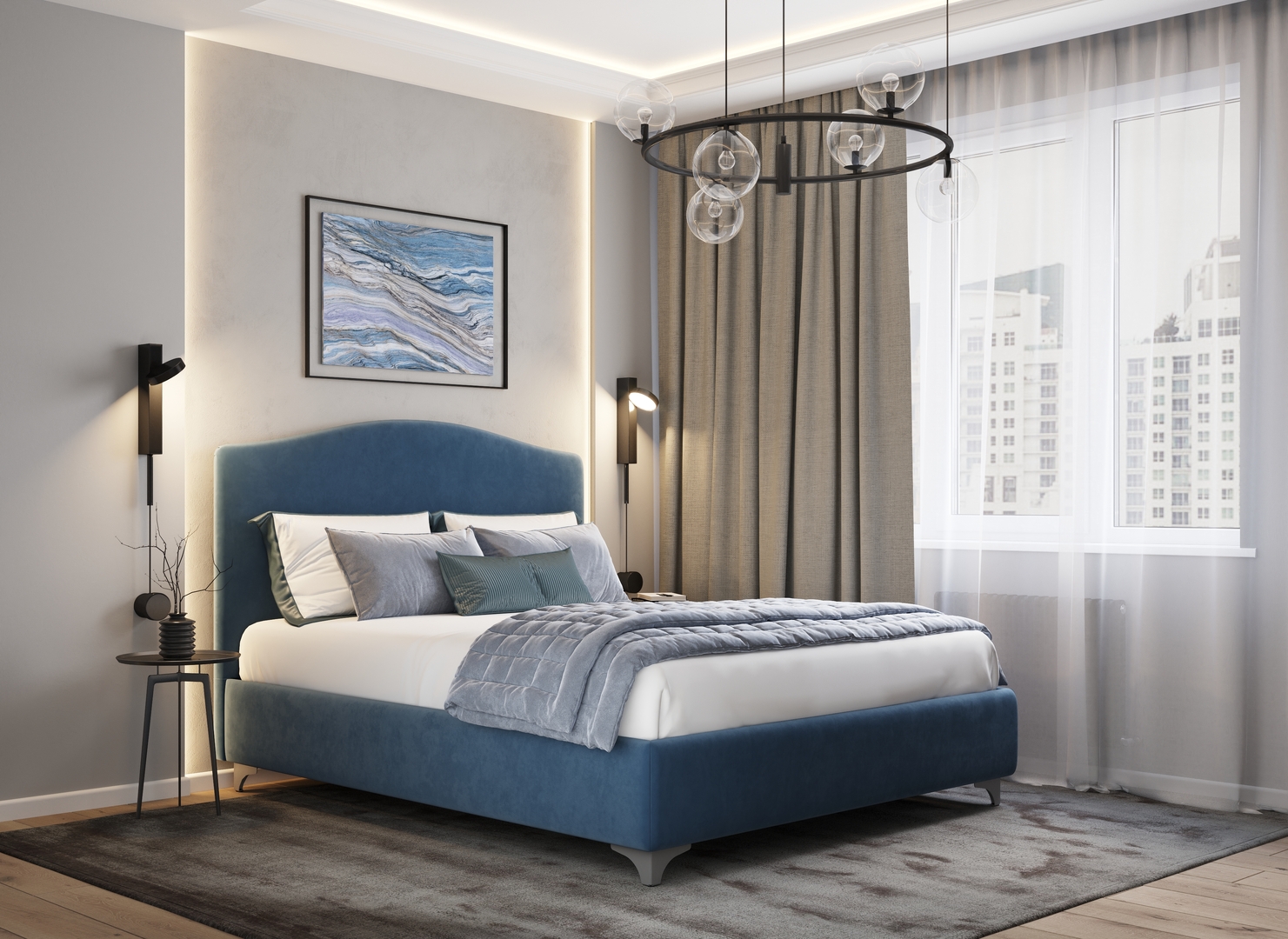 Разнообразие цветовой палитры позволит подобрать желаемый оттенок обивочного материала. Использование светлых цветов поддержит настроение стиля «Сканди». Нейтральные оттенки в цвет интерьера обыграют спальню в Современном стиле.